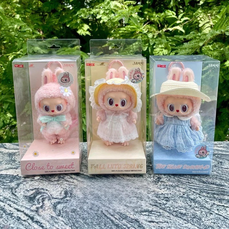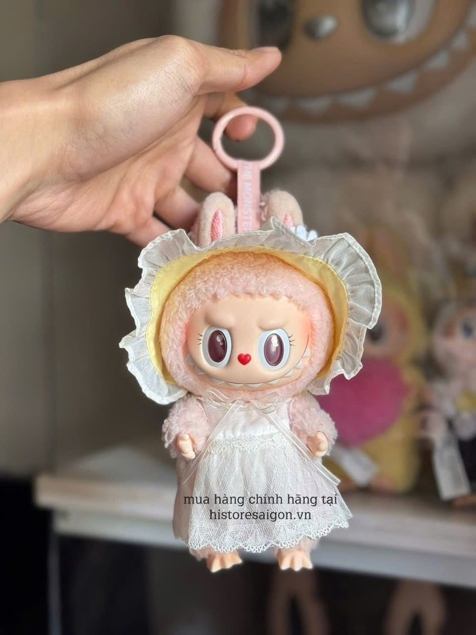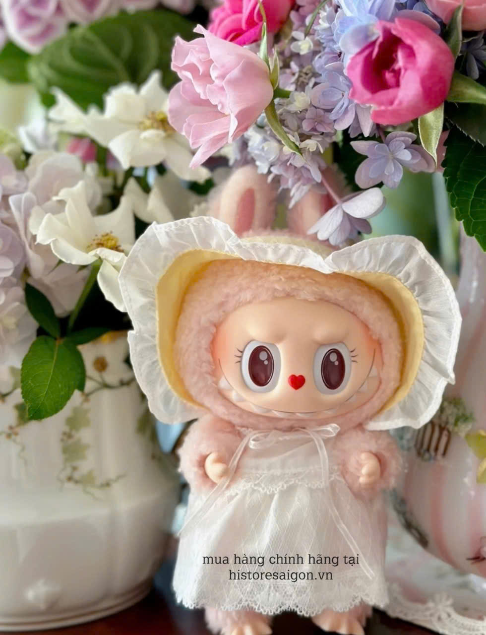 Mokoko V2 nhỏ khoác lên mình một chiếc váy và bonnet màu trắng – hồng pastel. Phần bonnet trùm nhẹ, để lộ đôi mắt ngấn nét hiền hòa, kết hợp với phần tai dài duyên dáng. Lớp plush mềm mại ôm nhẹ vinyl khuôn mặt và bàn tay, tạo cảm giác dễ chịu khi cầm trên tay. Khi mở hộp đóng gói cẩn thận, người sưu tầm như đang trải nghiệm một bản thu nhỏ của mùa xuân: mềm mại, trong trẻo và dịu dàng. Mỗi chi tiết ánh lên sự chỉn chu - từ lúc bóc hộp cho đến việc móc treo lên túi hoặc balô.