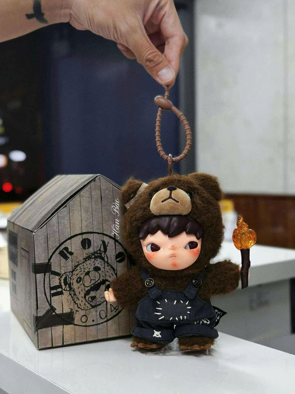 Hirono – Fight For Joy có chiều cao khoảng 16 cm, gồm phần thân bằng plush cao cấp và mặt cùng chi tiết tay làm từ vinyl/PVC. Em ấy mặc trang phục lấy cảm hứng từ gấu rừng hoang dã – bộ áo màu nâu vải lông xù ấm áp, gắn tai gấu và đường may tinh tế. Món đồ đi kèm là móc treo chắc chắn, tiện lợi để mang theo balo, túi xách, hoặc treo trong xe ô tô.