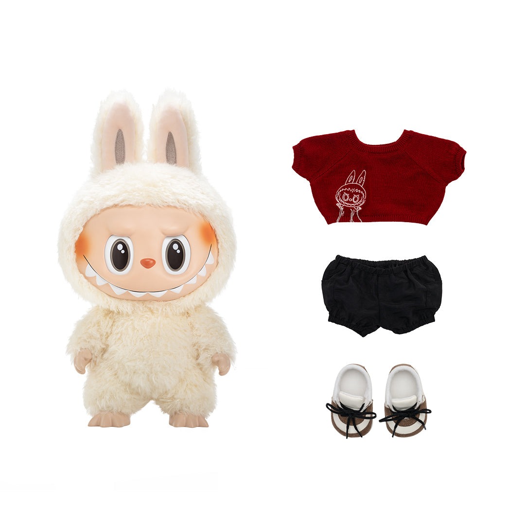 Trang phục Tết nổi bật: Labubu mặc áo len đỏ chúc “Best of Luck”, cùng họa tiết may mắn truyền thống như cỏ bốn lá, đồng xu, khăn quàng – mang cảm hứng phong cách Tết Việt và Á Đông .