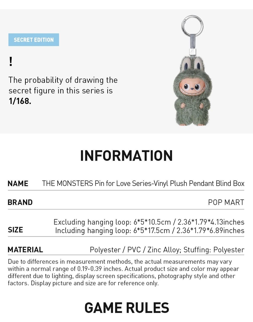 Kích thước: khoảng 10.5 cm, thiết kế plush pendant nhỏ gọn dễ mang theo