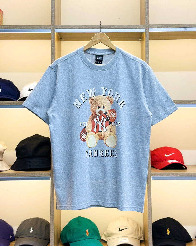 Thiết kế iconic: Áo thun New Era nổi bật với logo thương hiệu thêu hoặc in sắc nét ở ngực hoặc tay áo, thường đi kèm các chi tiết đội bóng MLB (như New York Yankees, LA Dodgers) hoặc graphic print độc đáo. Cổ tròn (crewneck) hoặc cổ chữ V (v-neck) với fit relaxed hoặc regular, phù hợp cho cả nam và nữ.