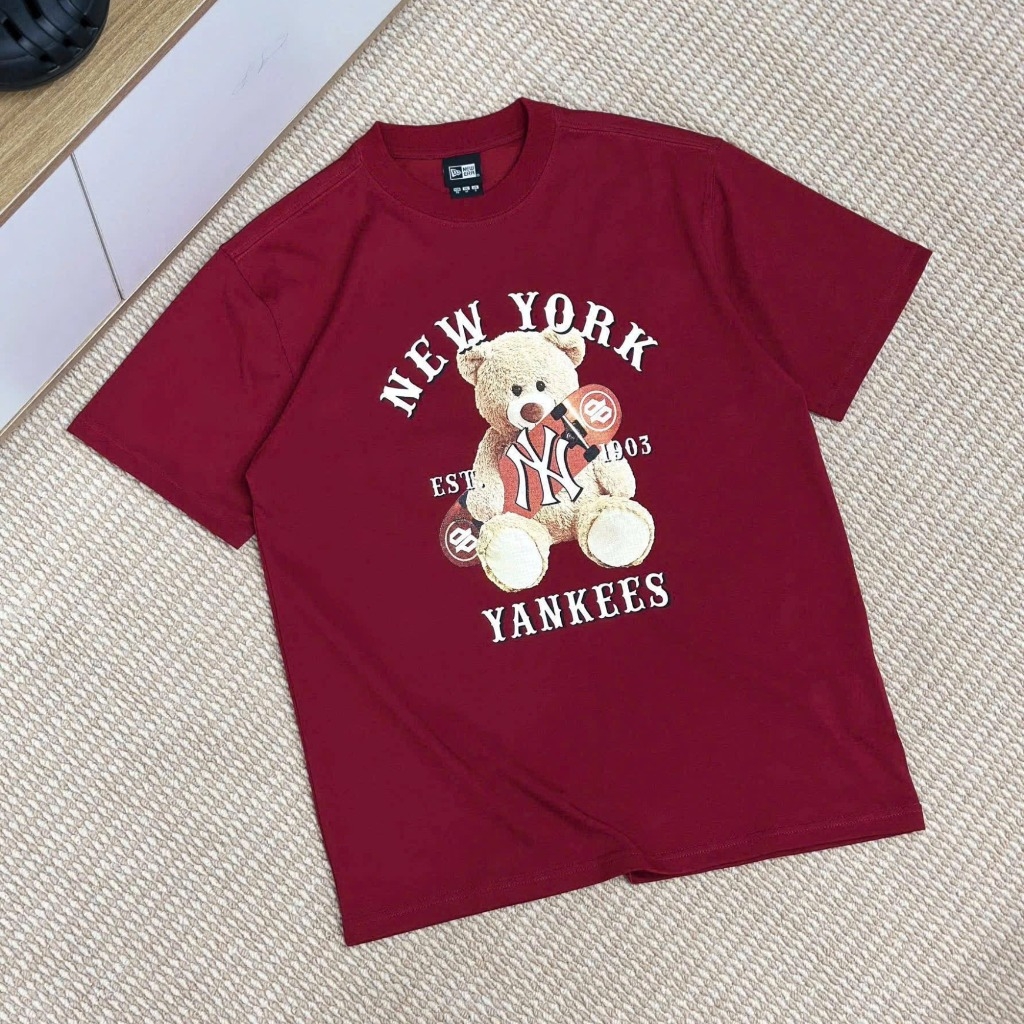 Thiết kế iconic: Áo thun New Era nổi bật với logo thương hiệu thêu hoặc in sắc nét ở ngực hoặc tay áo, thường đi kèm các chi tiết đội bóng MLB (như New York Yankees, LA Dodgers) hoặc graphic print độc đáo. Cổ tròn (crewneck) hoặc cổ chữ V (v-neck) với fit relaxed hoặc regular, phù hợp cho cả nam và nữ.