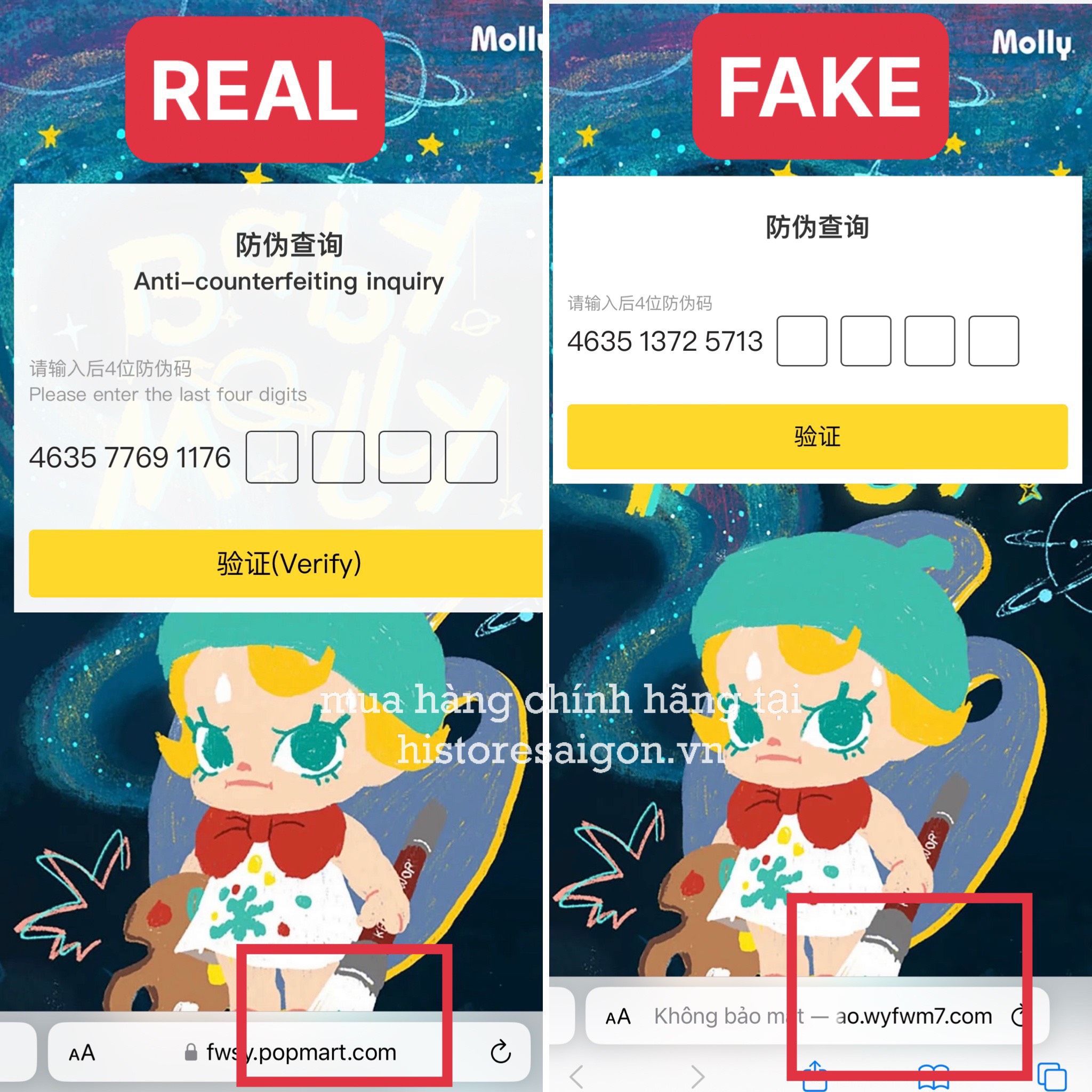 - Ở hàng thật, khi quét QR sẽ xuất hiện link dẫn tới website chính thức của POPMART với tên miền như hình. Ngoài ra, phần khung để ta nhập mã cũng to hơn trong hơn và thuận mắt hơn.