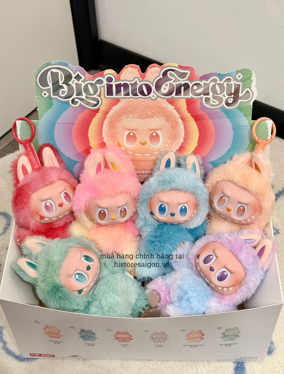 The Monsters Big Into Energy là bộ sưu tập được phát hành dưới dạng hộp mù, gồm 6 phiên bản phổ thông với màu sắc đại diện cho các nguồn năng lượng khác nhau: Labubu V3 Love (đỏ - Tình yêu), Labubu V3 Happiness (cam - Hạnh Phúc), Labubu V3 Loyalty (hồng – vàng - Trung Thành), Labubu V3 Serenity (xanh lá - Bình Yên), Labubu V3 Hope (xanh dương - Hi Vọng) và Labubu V3 Luck (tím - May Mắn).