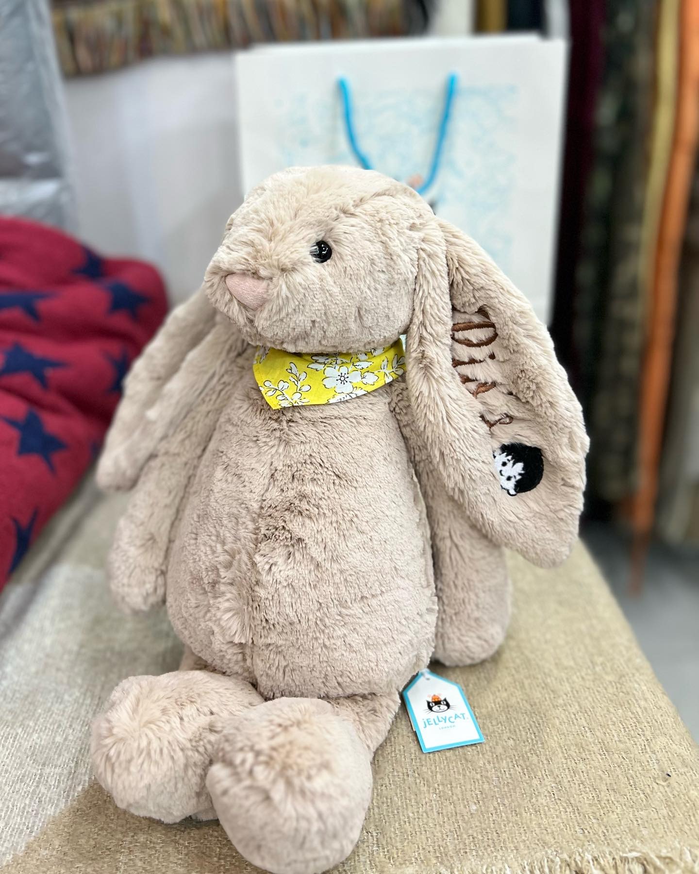 Không phải tự nhiên mà trào lưu thêu tên Jellycat ngày càng phổ biến, nhất là trong nhóm mua làm quà tặng. Đầu tiên là cảm giác “thuộc về”. Khi trên tai, cổ hay chân thú bông có thêu tên mình, người nhận sẽ có cảm giác đây là món đồ dành riêng cho mình, không phải hàng sản xuất hàng loạt.